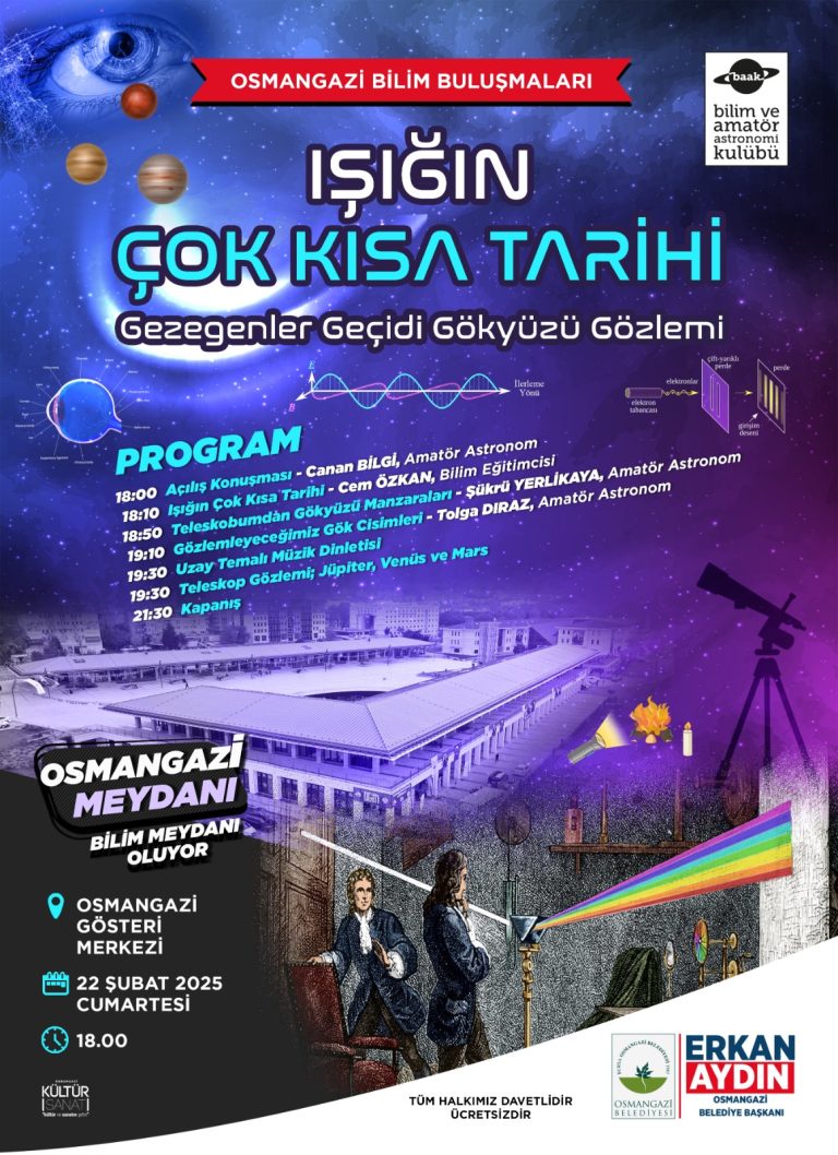 Osmangazi Bilim Buluşmaları’nda Işığın Keşif Öyküsü Anlatıldı… Osmangazi Belediyesi ile BAAK (Bilim ve Amatör Astronomi Kulübü) iş birliğiyle düzenlenen “Osmangazi Bilim Buluşmaları” serisinin yedinci etkinliği, 22 Şubat 2025 Cumartesi akşamı Osmangazi Meydanı ve OGM Sahnesi’nde gerçekleştirildi. Osmangazi Meydanı’ndaki OGM Salonunda…