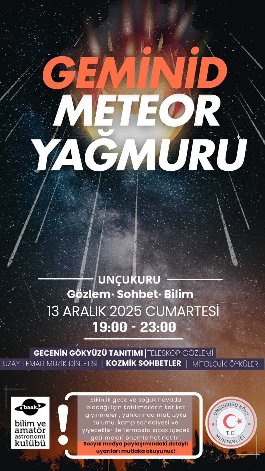 Yılın En Görkemli Gök Olayı: Unçukuru’nda Meteor Şöleni! Bilim ve gökyüzü tutkunları, hazır mısınız? BAAK, Nilüfer Belediyesi ve Unçukuru Muhtarlığının desteğiyle, 2025’in en önemli gök olayına tanıklık etmek için şehir