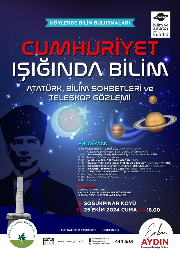 Cumhuriyet Bayramı haftasında, 24 Ekim 2024 Cuma akşamı, Uludağ’ın eteklerinde bulunan ve Cumhuriyet’in 10. yılı anısına dikilen anıt taşlarını koruyan nadir köylerden biri olan Soğukpınar’da, Osmangazi Belediyesi ile birlikte gerçekleştirdiğimiz “Cumhuriyet Işığında Bilim” temalı etkinliğimize köyden ve kentten gelen cumhuriyet…