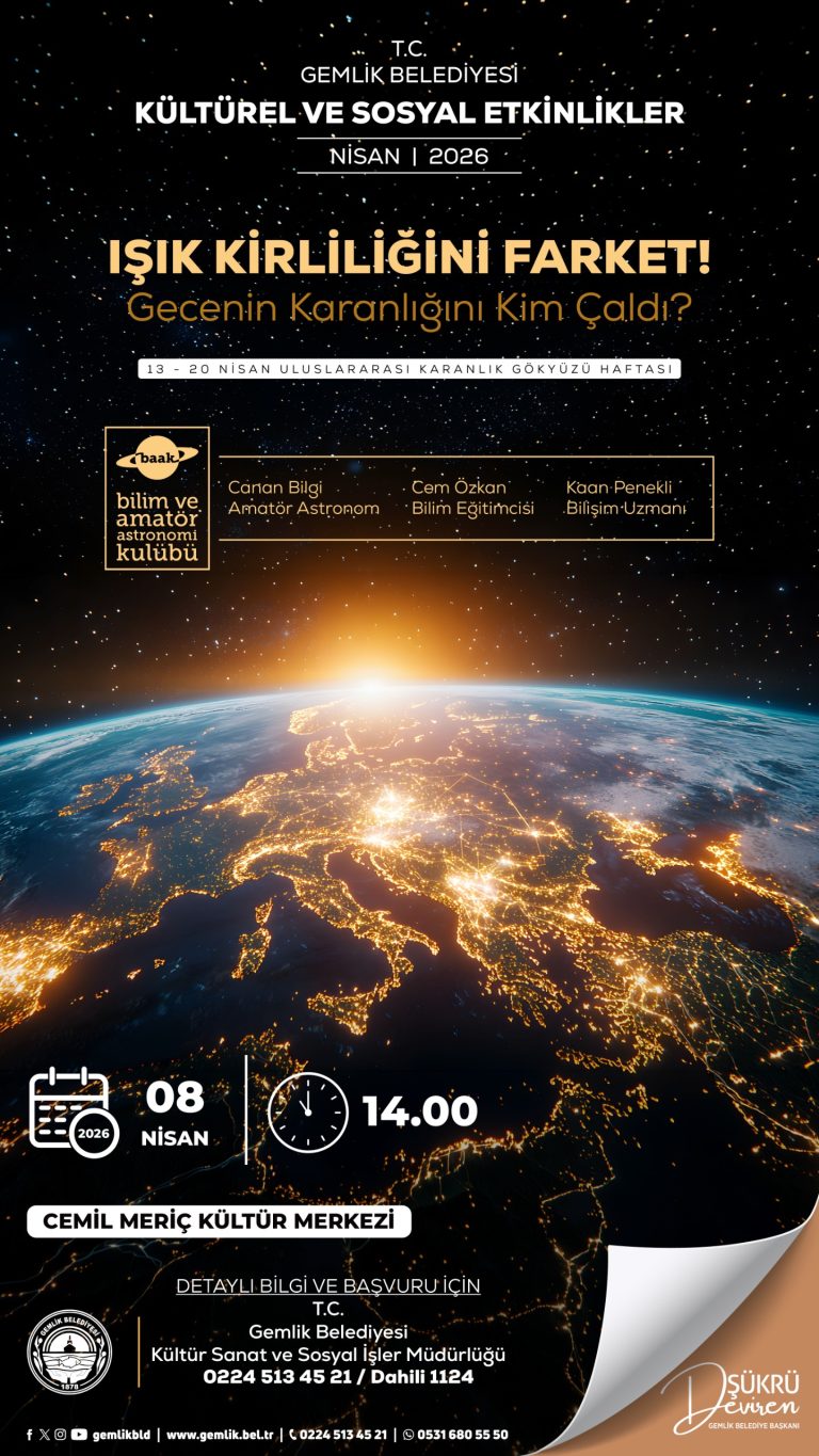 Gecenin Karanlığını Kim Çaldı? 🌌 Gereksiz ışıklar sadece enerji değil, geleceğimizi de tüketiyor; sağlığımızı, doğayı ve ekosistemi de “bombalıyor”. Dünya Karanlık Gökyüzü Haftası (13 – 20 Nisan 2026) yaklaşırken, biz de Gemlik’ten bir çağrı başlatıyoruz: “Karanlığa Dön! (Go Dark)” 🌑…