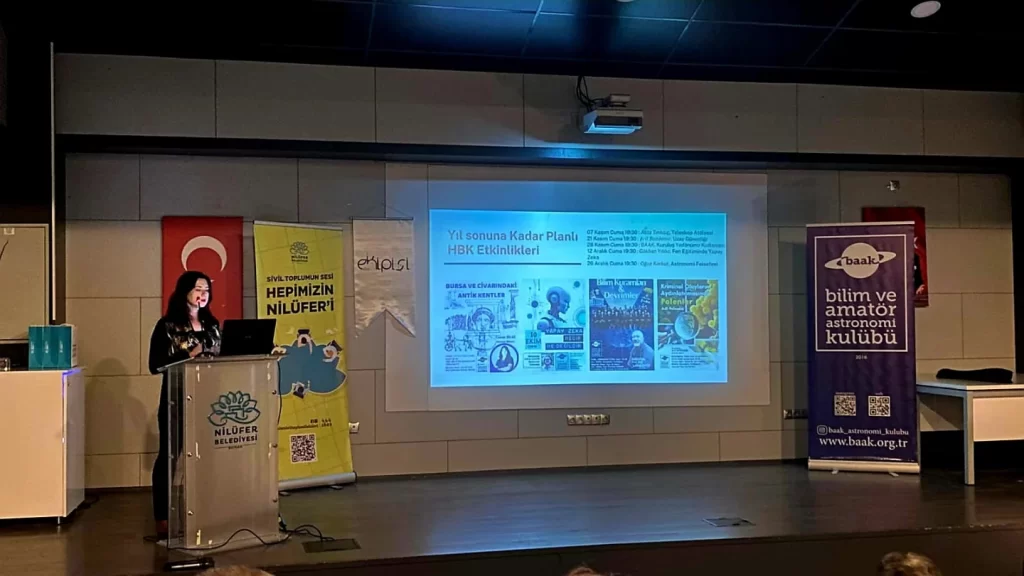 Nilüfer Belediyesi’nin 30 Ekim Perşembe akşamı düzenlediği “Sivil İzler: Sivil Toplum Söyleşileri” programında, Karaman Dernekler Yerleşkesi’nde heyecan verici sosyal girişimlerimizi anlattık. Sivil toplum kuruluşlarının aralarındaki dayanışmayı artırmayı amaçlayan bu özel etkinlikte; Sınır Tanımayan Doğa Çevre Kültür ve Sanat Derneği ve Ekipişi Film Bağımsız Kısa Film ve Sinema Derneği’ni dinledik. Cem Özkan, İlhan Vardar, Canan Bilgi ve Tolga Dıraz’ın anlatıcılığında bizler de derneğimizin vizyon ve misyonunu ifade ederek derneğimizi tanıttık ve Türkiye’nin ilk “Karanlık Gökyüzü Parkı” kurma serüvenimizi, “Halkın Bilim Kürsüsü” ve “Vatandaş Bilimi” gibi sosyal girişimlerimizle bilimi laboratuvardan sokağa nasıl taşıdığımızı anlattık. Katılımcılara, sunum yapan tüm derneklere, Nilüfer Belediyesi’ne ve çalışanlarına ve BAAK ekibine çok teşekkür ederiz!